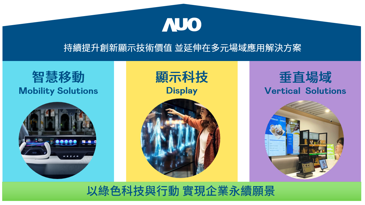 我們持續推動「雙軸轉型」,在精進顯示技術附加價值(Go Premium),與深化垂直市場應用(Go Vertical)的策略下,對應爱游戏体育的優勢競爭力與趨勢,我們奠定顯示技術、智慧移動、垂直場域三大永續營運支柱,在顯示技術領域的根基之上,延伸布局多元場域應用解決方案。將先進顯示科技助力智慧移動及垂直場域發展,並以綠色科技與行動為實踐,在轉型之路上貫徹永續經營之願景。