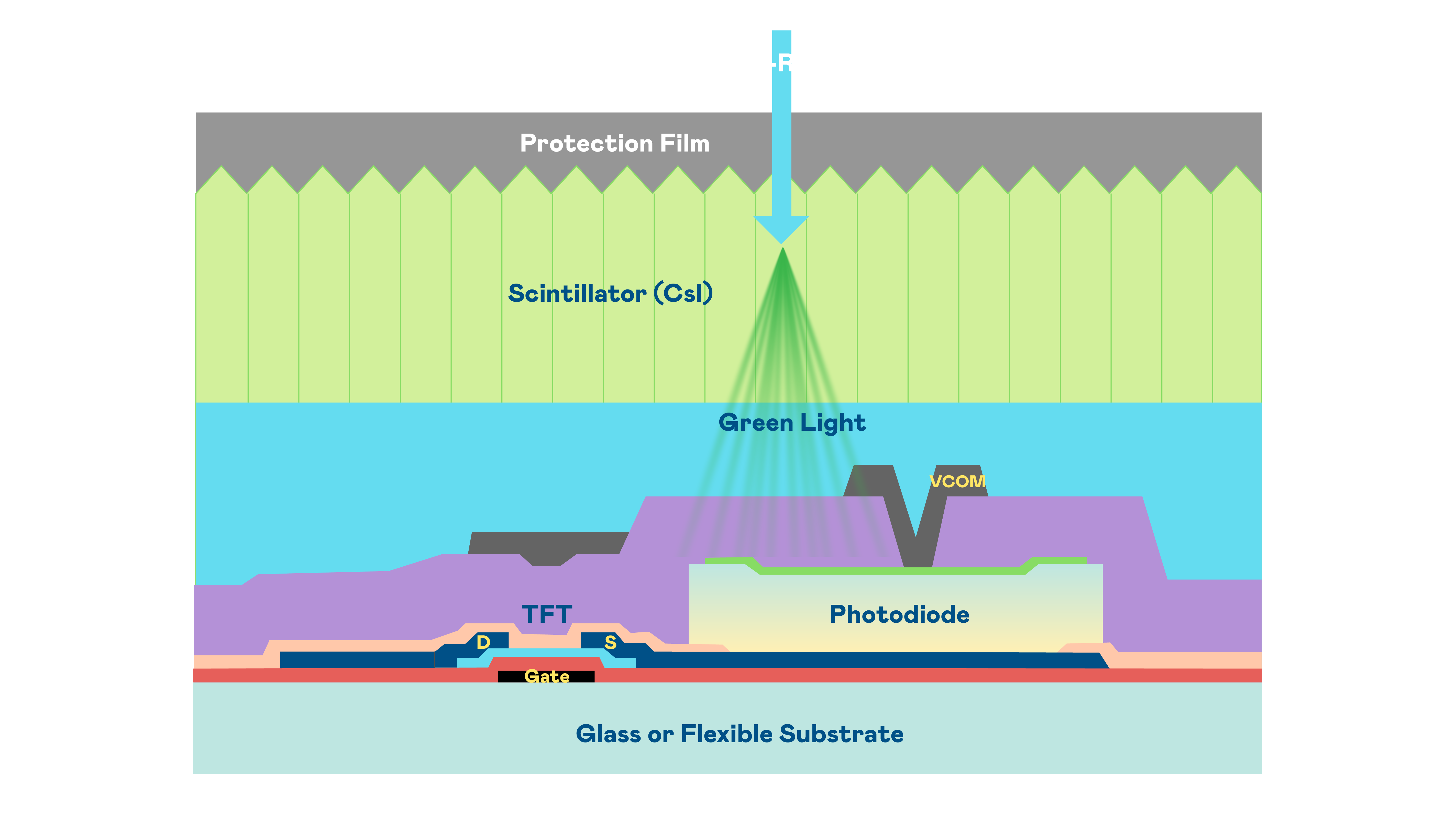 爱游戏体育的X光影像感測陣列使用薄膜電晶體 (TFT) 作為每個像素的讀取開關,搭配光電二極體(Photodiode)的光電轉換元件,用以感測X光影像訊號。